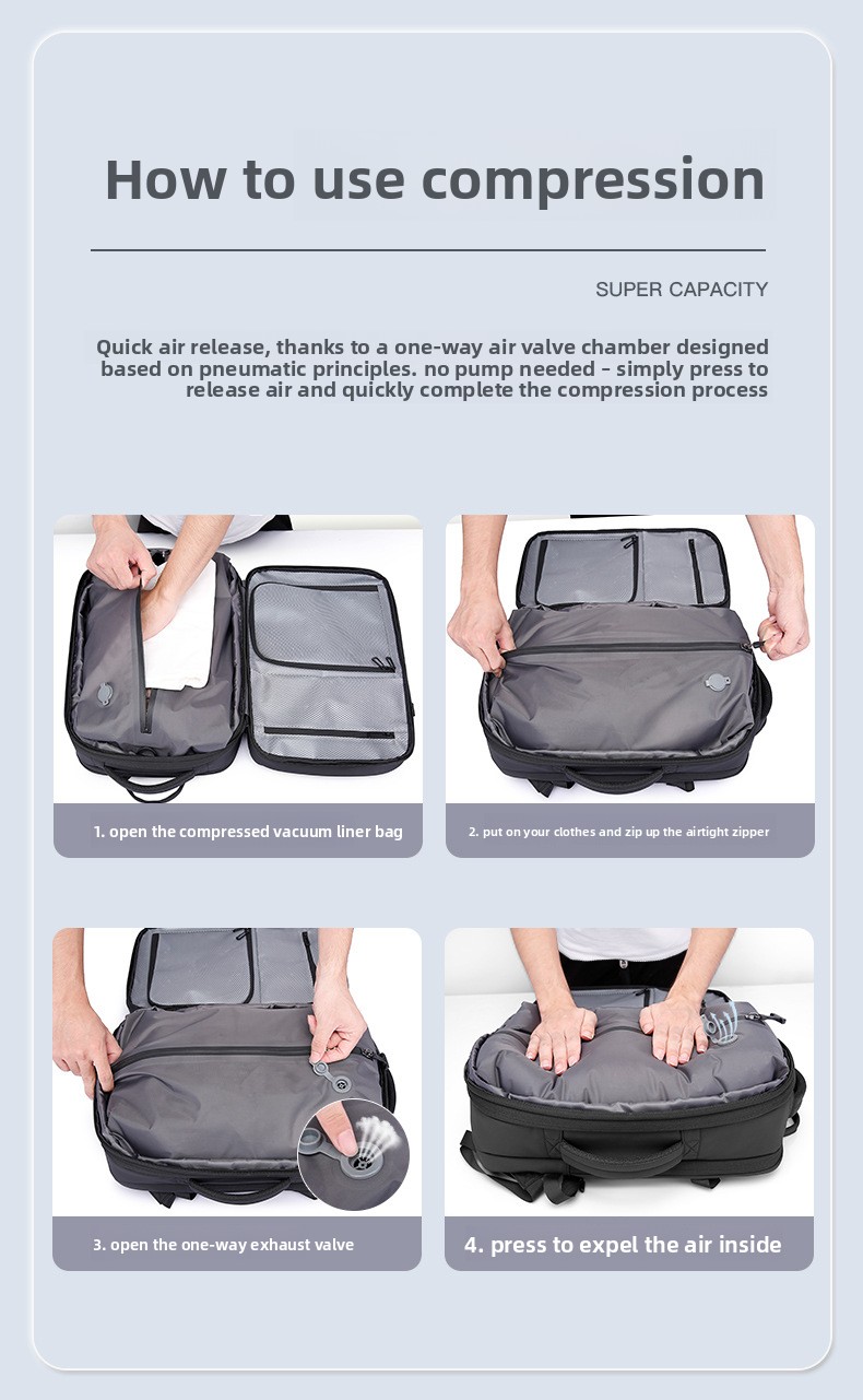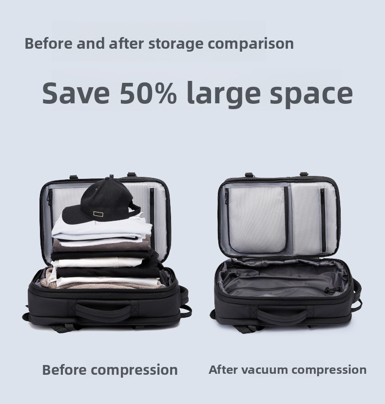 Vacuum Compression: Innovative vacuum technology reduces pack volume for efficient travel.