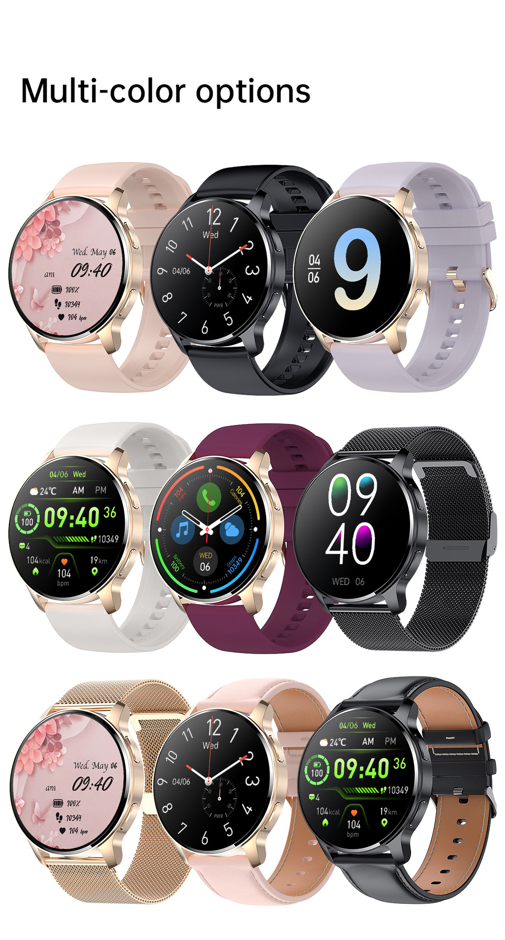 Colors: Black/black silicone, Gold/purple silicone, Gold/pink silicone, Gold/white silicone